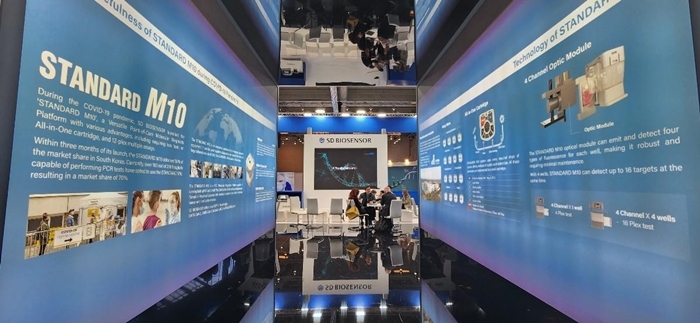 에스디바이오센서 단독 부스에서는 '코로나19 펜데믹 중 M10의 유용성'과 'M10의 기술력'을 주제로 터널형 전시 공간을 마련하여 방문객의 이목을 끌었다.
