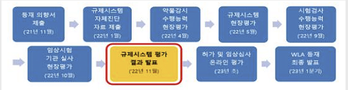식약처는 자체적으로 규제시스템, 시판허가, 약물감시, 시장감시, 업허가, 규제실사, 시험‧검사, 임상시험, 국가출하승인 등 9개 영역, 268개 지표에 대한 평가를 진행한 이후, 2021년 11월 WLA 등재 신청 의향서를 제출했다.