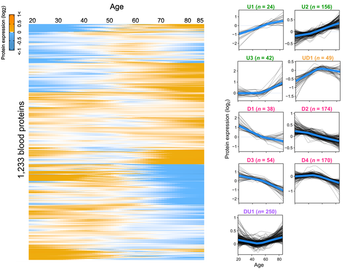 또한 1,233개의 혈액 단백질이 주요한 노화 발현 패턴을 보이는 것으로 확인돼 인간의 생물학적 나이를 측정하는 개념인 '노화 시계(Aging clock)'로서 역할을 할 수 있음을 제시했다.