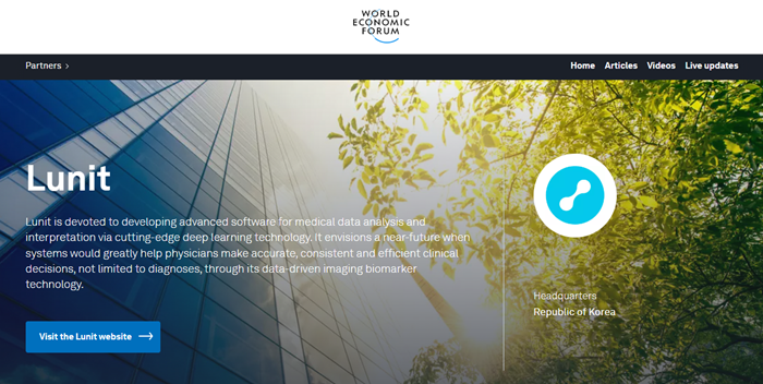 루닛은 지난 2020년 세계경제포럼이 유망한 초기 스타트업을 선별하는 '테크놀로지 파이오니어(Technology Pioneers)'에 한국 기업으로는 유일하게 선정된 바 있다.