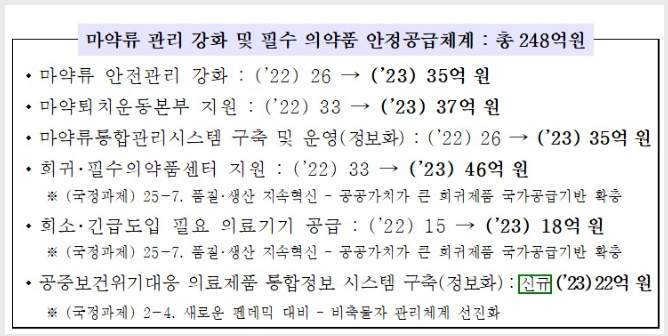 의료용 마약류 오남용 방지를 위해 마약류통합관리시스템을 고도화하고 국가 주도 희귀필수약 위탁 생산을 확대할 예산도 국회를 통과했다.