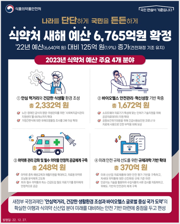 주요 4개 분야 예산을 살펴보면 안심 먹거리 예산 2332억원, 바이오헬스 안전관리·혁신성장 기반 확충 예산 1672억원, 마약류 관리 강화·필수약 안정공급체계 구축 예산 248억원, 미래 안전규제 선도를 위한 규제과학 기반 확대 예산 370억원이 반영됐다.