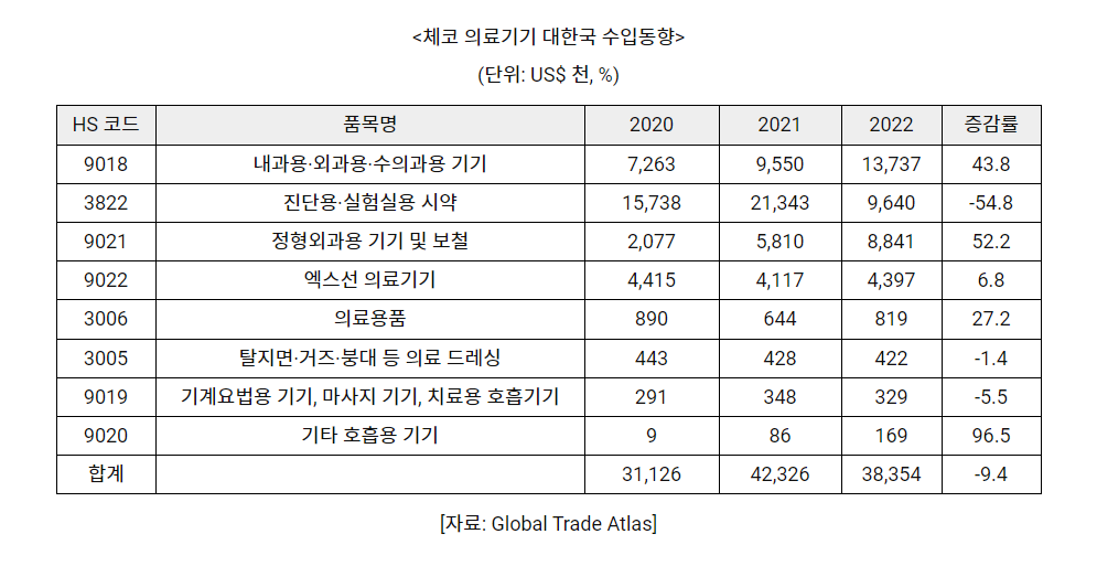 한편 체코의 2022년 의료기기 수입은 전년 대비 2.6% 증가한 20억 달러를 기록했다.